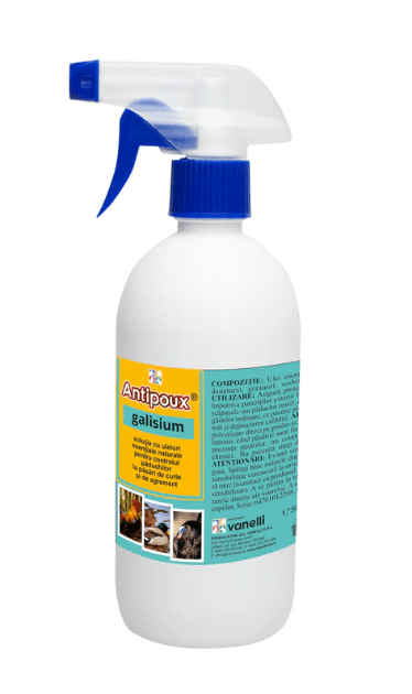 COMPOZIŢIE: Ulei esenţial de citronella, alcool etilic denaturat, geraniol, sorbital T80, apă demineralizată. UTILIZARE: Asigură protecţie naturală, sigură şi eficientă împotriva paraziţilor externi la păsări, cum ar fi acarienii roşii (căpuşele sau păduchii roşii), cei mai importanţi ectoparaziţi ai găinilor ouătoare, ce produc pierderi prin scăderea producţiei de ouă şi deprecierea calităţii. ADMINISTRARE: Se aplică prin pulverizare direct pe pasăre şi în adăpost la o oră după stingerea luminii, când păsările sunt liniştite. Soluţia poate fi aplicată în prezenţa păsărilor, nu conţine pesticide sau alte substanţe chimice. Nu necesită timp de aşteptare până la sacrificare. ATENŢIONĂRI: Evitaţi contactul direct cu pielea, ochii şi gura. Spălaţi bine mâinile după utilizare. Persoanele care au o sensibilitate cunoscută la oricare dintre componenţi nu trebuie să intre în contact cu produsul. Poate produce reacţii de iritare şi sensibilizare. A se păstra la temperaturi până în 25oC, ferit de razele directe ale soarelui. A nu se lăsa la vederea şi îndemâna copiilor.